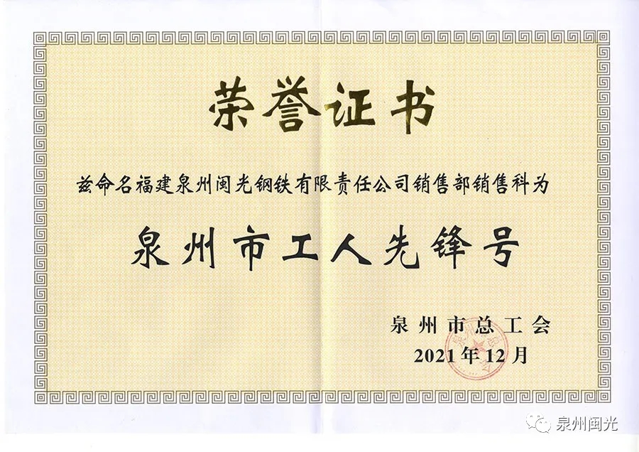 日前,泉州市總工會(huì)按照自下而上、逐級(jí)推薦、群眾認(rèn)可、嚴(yán)格考核決定授予我司銷售部銷售科“泉州市工人先鋒號(hào)”榮譽(yù)稱號(hào)。1月6日上午,公司工會(huì)主席李盟城特此為該科室頒發(fā)榮譽(yù)獎(jiǎng)牌和榮譽(yù)證書。